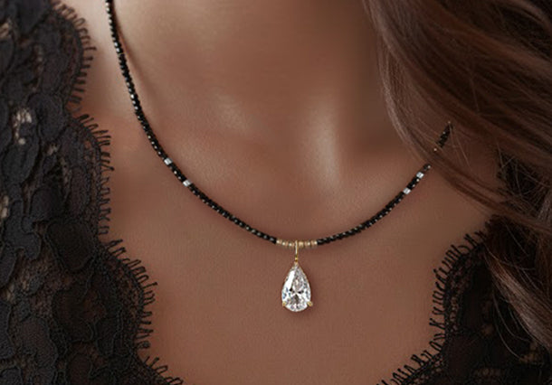 Collier gradué de 215 petits diamants noirs facetés totalisant 29 carats avec petits ornemants en or blanc et jaune 14kt. Diamant de laboratoire de taille poire de 3.09cts sur monture en or jaune 14kt.