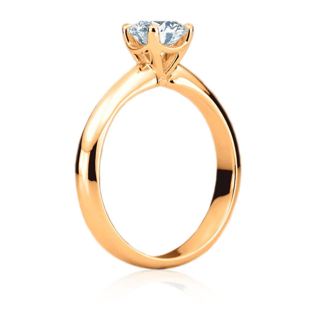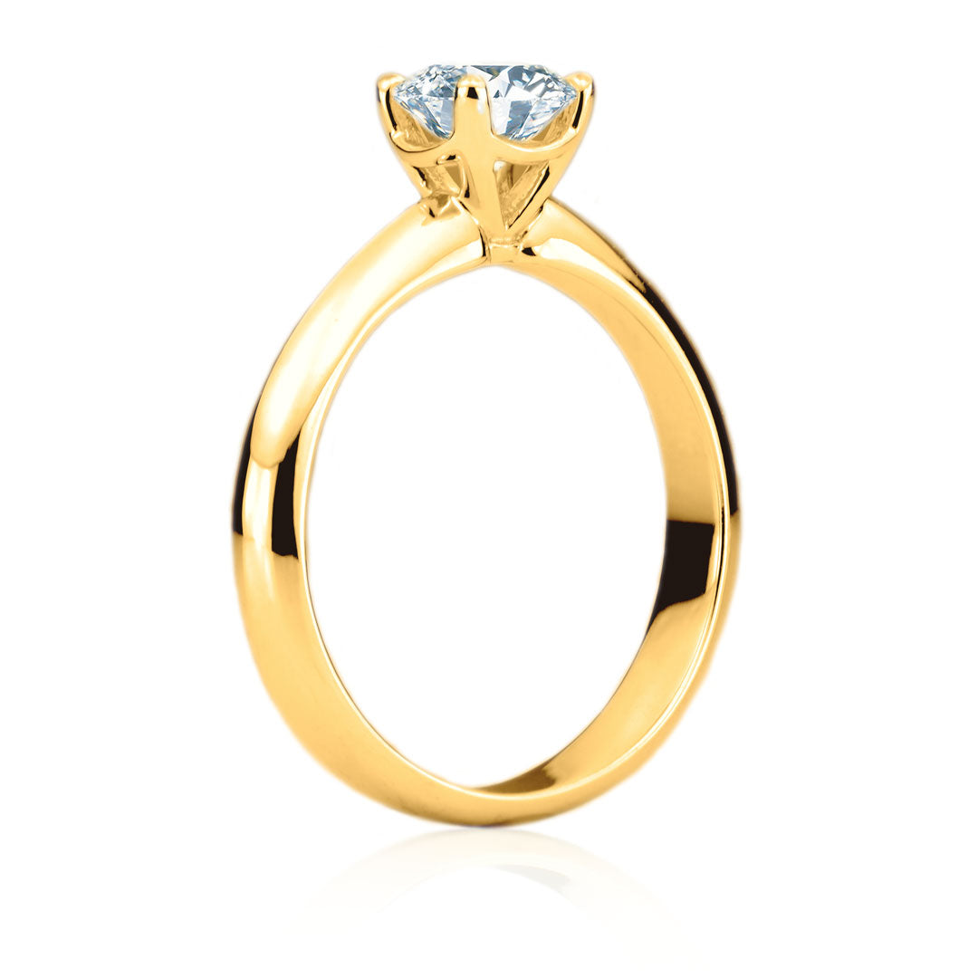 La bague de fiançailles Gabrielle à diamant solitaire est fait d'or 18 carats. Le diamant central d'origine canadienne ou de laboratoire est offert dans un éventail de carats, de couleurs et de puretés.